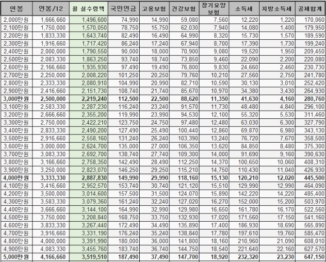 2023년도 연봉별 실수령 (소득세 및 4대보험 공제후 수령액 정리)